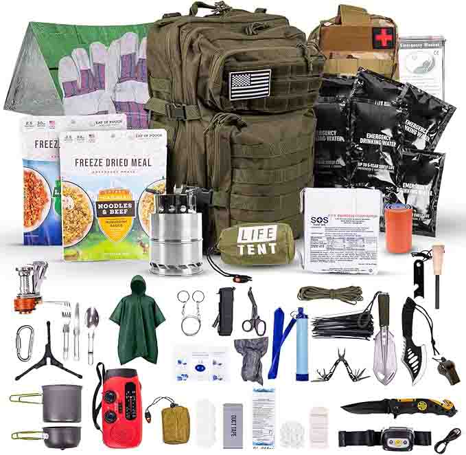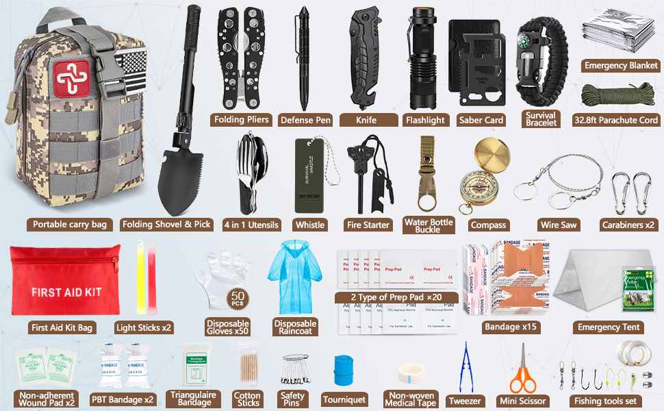 238 st Emergency Survival Kit och First Aid Kit är konstruerad för vandrare, campare, räddningsteam och alla som förbereder sig för oväntade nödsituationer utomhus. Använder hållbara, väderbeständiga material och professionell kvalitet komponenter, dettakit ger viktiga verktyg för överlevnad, navigering, första hjälpen och nödsignalering.