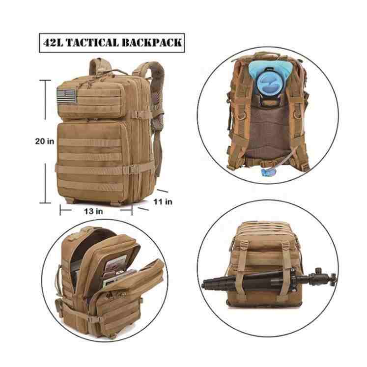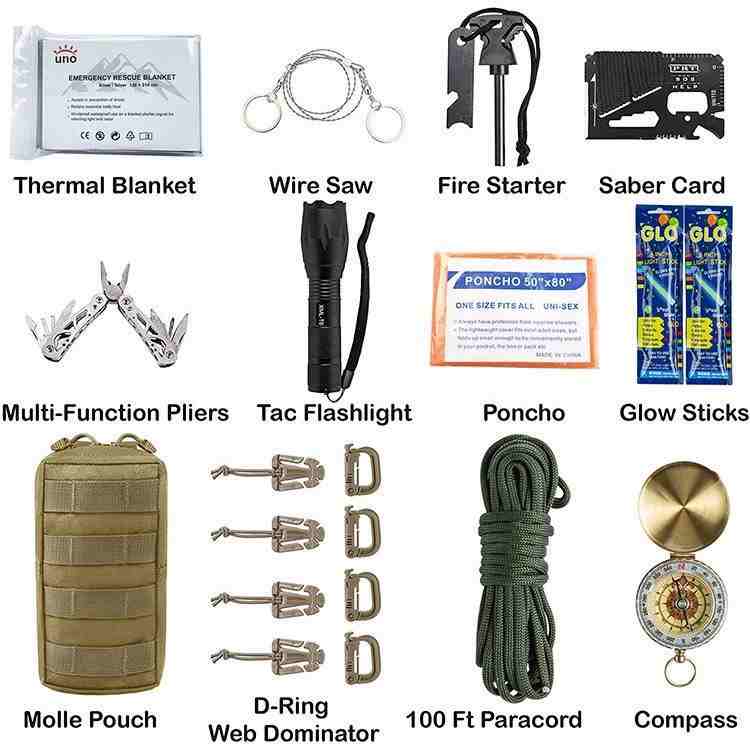Military Tactical 72H Emergency Survival Kit innehåller medicinska första hjälpen-förnödenheter och praktiska verktyg för utomhusresor, camping och andra scenarier, för att möta behoven av medicinskt och utomhusnöje. Överlevnadsväskan har ett spänne som kan hängas på bältet eller ryggsäcken, vilket gör den lätt att bära. Invändiga fack för enkel åtkomst.