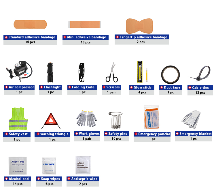 Den innehåller bandhjälpmedel, bomullsbollar i desinfektion, bandage, sax, pincett, etc. Dessa föremål kan hantera mindre snitt och skador som kan förekomma på vägen.